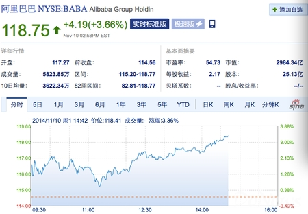 截至目前,阿里股价每股报118.75美元,涨幅达4.19%,阿里集团整体市值达2981.63亿美元。